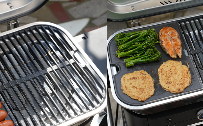 Recommend the use of 1 griddle. The griddle should be placed on the one side. Remove the cooking grate on the other-one side and insert the griddle into place.